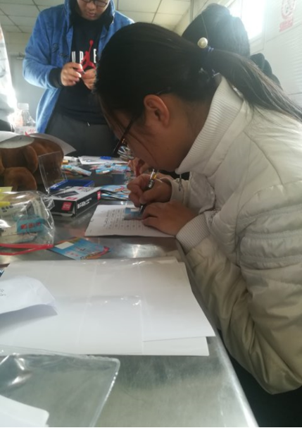 到了德胜门公交总站以后,大家首先领取了卡片等材料,之后很快的进入了工作状态。按照之前的分组,一部分人登记填写学生信息卡以及修剪和粘贴相片,一部分同学粘贴防伪标签、加盖印章、粘贴公交卡保护膜。最终,在大家的共同努力下,本次共为我院学生办理公交卡338张,办理过程中现金、资料及公交卡无一遗漏和错误。