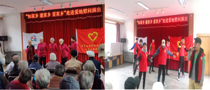 主持人富有诗意的开场白结束后,演出拉开了序幕。首先由七位同学表演的广场舞《最炫民族风》让老人们感受到了年轻人的活力,并赢得了全场老人热烈的掌声。爷爷奶奶这边也不甘示弱,有五位奶奶作为代表,清唱了一首《沙家浜》使我们感受到了时代的气息。演出过程中一位志愿者的舞蹈把老人们的情绪带到了高潮,轻步曼舞像燕子伏巢,全场掌声不断。最后一首老人们演唱的《北京的小吃》以及《正阳门》仿佛把我们带进了老北京的巷子里的生活。随后,同学们与老人进行了合影并在欢声笑语中把老人们送回了住所,和老人们进行了愉快的聊天,同学们的笑话把老人逗得哈哈大笑,活动在大家的欢声笑语中结束了。