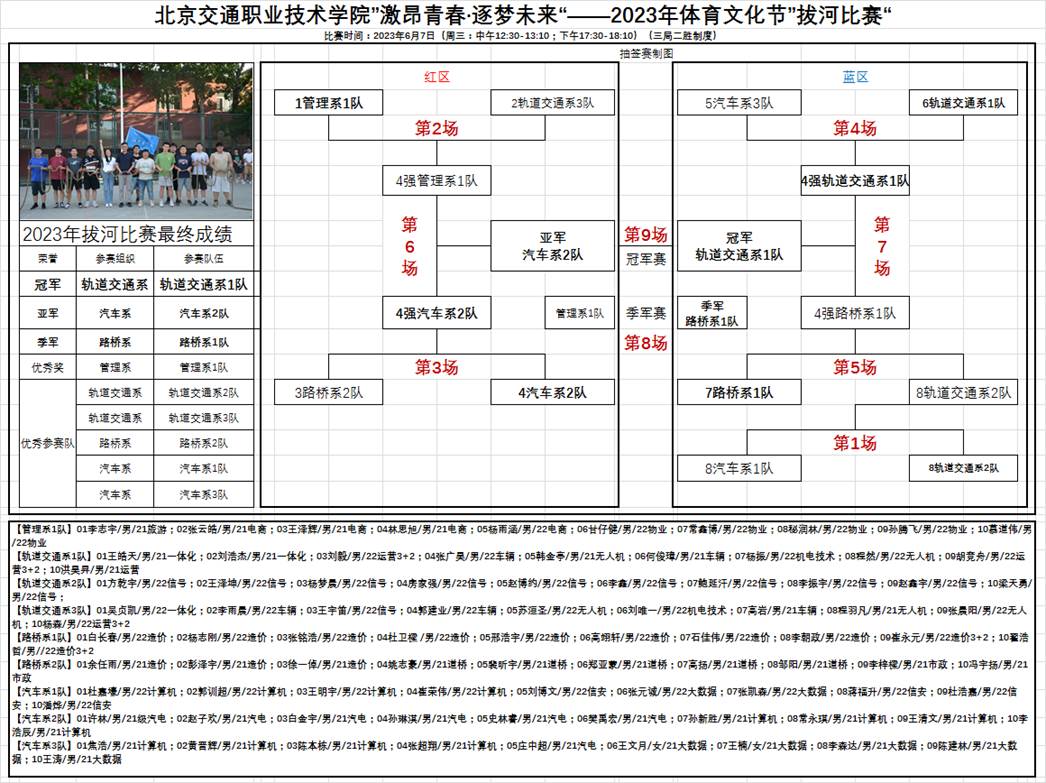 本次比赛以各系代表队通过抽签决定比赛对手,采取三局两胜淘汰赛制。在比赛过程中,加油声此起彼伏,紧绷的绳子被拉得咯咯响,但红线始终轻轻摇摆,琢磨不定,现场的气氛也是越来越高涨。来回拉扯的红绳也来回拉扯着观众们悬着的心,赛场上队员们奋力拼搏,赛场下的观众们也在奋力加油。通过激烈角逐,轨道交通系1号队伍荣获冠军,汽车系2号队伍荣获亚军,路桥系1号队和管理系1号队分别荣获三四名。