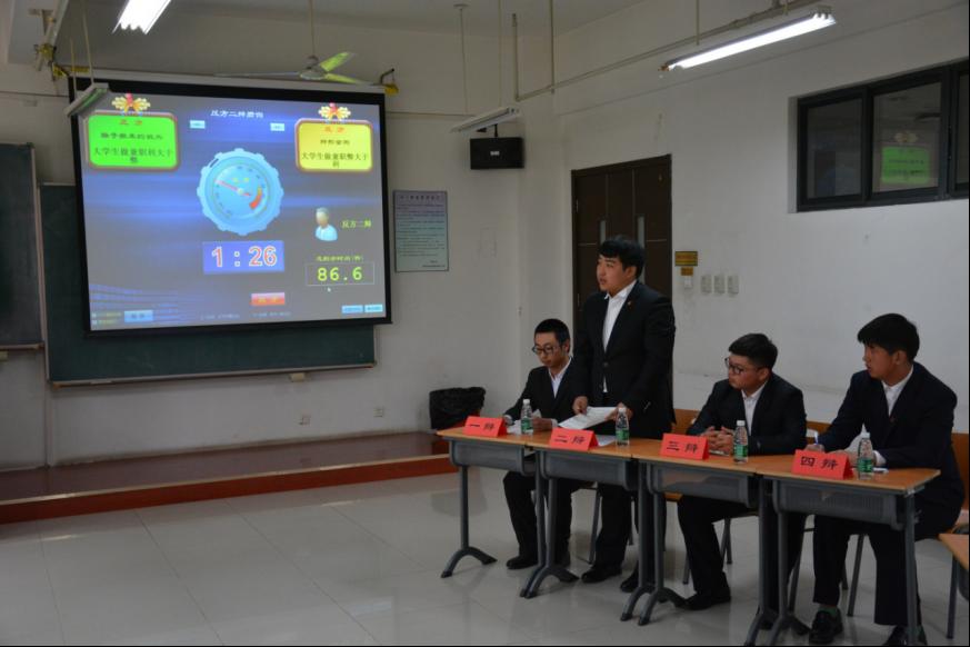 我院选派的10名参赛选手思维敏捷,慷慨激昂,为本届辩论赛增添了浓重色彩。我院两支辩论队分别与北京化工大学和中央财经大学围绕“经典影视作品的翻拍利大于弊还是弊大于利”和“大学生兼职弊大于利还是利大于弊”两个辩题经过开篇立论、双方对辩、自由辩论、总结陈词等几个回合展开了精彩、激烈的辩论。比赛过程中,选手个个信心十足、默契配合、妙语连珠、当仁不让,展现了较为出众的专业素养和思辨能力,他们坚持不懈的精神和齐心协力的努力得到各位评委的一致好评,并且刘志鹏同学荣获“最佳辩手”称号。