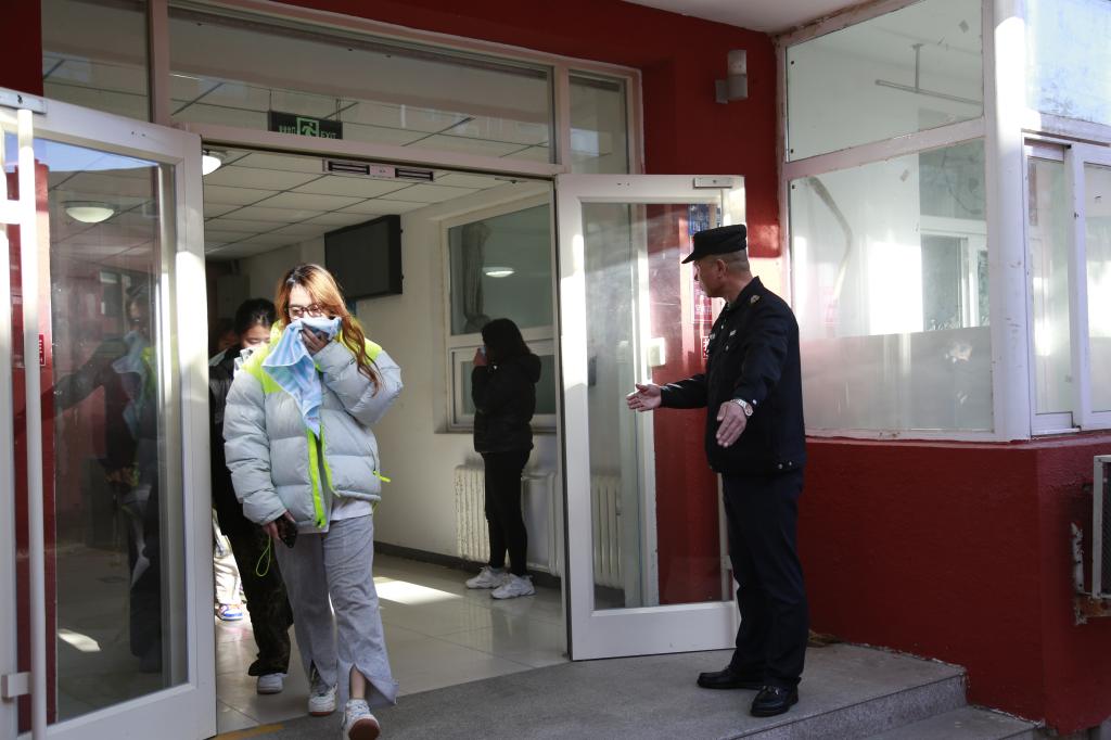 演练现场,总指挥王颖副院长通过消防广播宣布疏散逃生演练正式开始。12:15,演练流程有序拉开:宿管员发现宿舍楼二层发生火情,中控室立即响应,并在总指挥指示下启动消防应急疏散预案;随后宿管员首先在宿舍楼内通过消防广播进行通知预警并迅速上楼进行排查,确认是二层楼道出现火情,即刻拿取就近的灭火器、消火栓进行灭火;疏散组的工作人员则有序组织学生按照逃生通道进行疏散;微站队员上楼进行滞留人员情况排查;警戒组做好楼门警戒;截至12:25,火情被完全控制;12:30,全部学生疏散到室外安全空旷地带,警情完全解除;医疗救护组、影像采集组密切配合,一切工作有条不紊的进行,演练顺利结束。