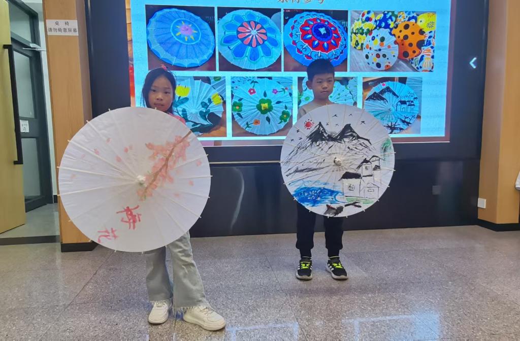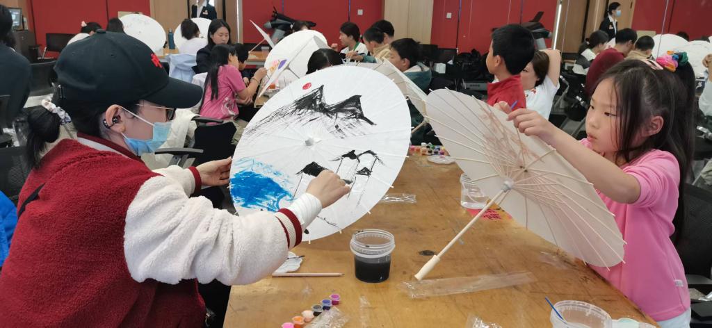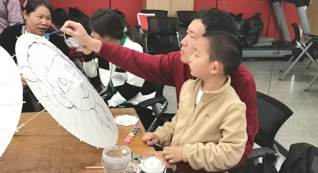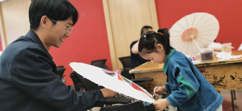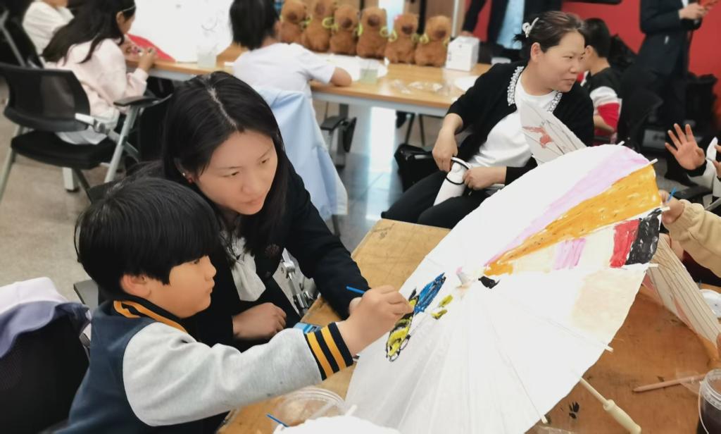 在陈老师的示范和指导下,家长和孩子们纷纷拿起画笔,发挥自己的创意,在洁白的油纸伞面上尽情创作,描绘出各种图案。现场的亲子家庭温馨满满,他们相互协作、相互启发,共同完成了别出心裁、独一无二的油纸伞,增进了亲子之间的情感交流。