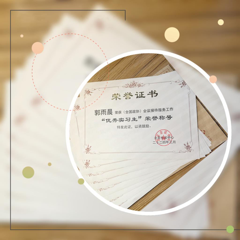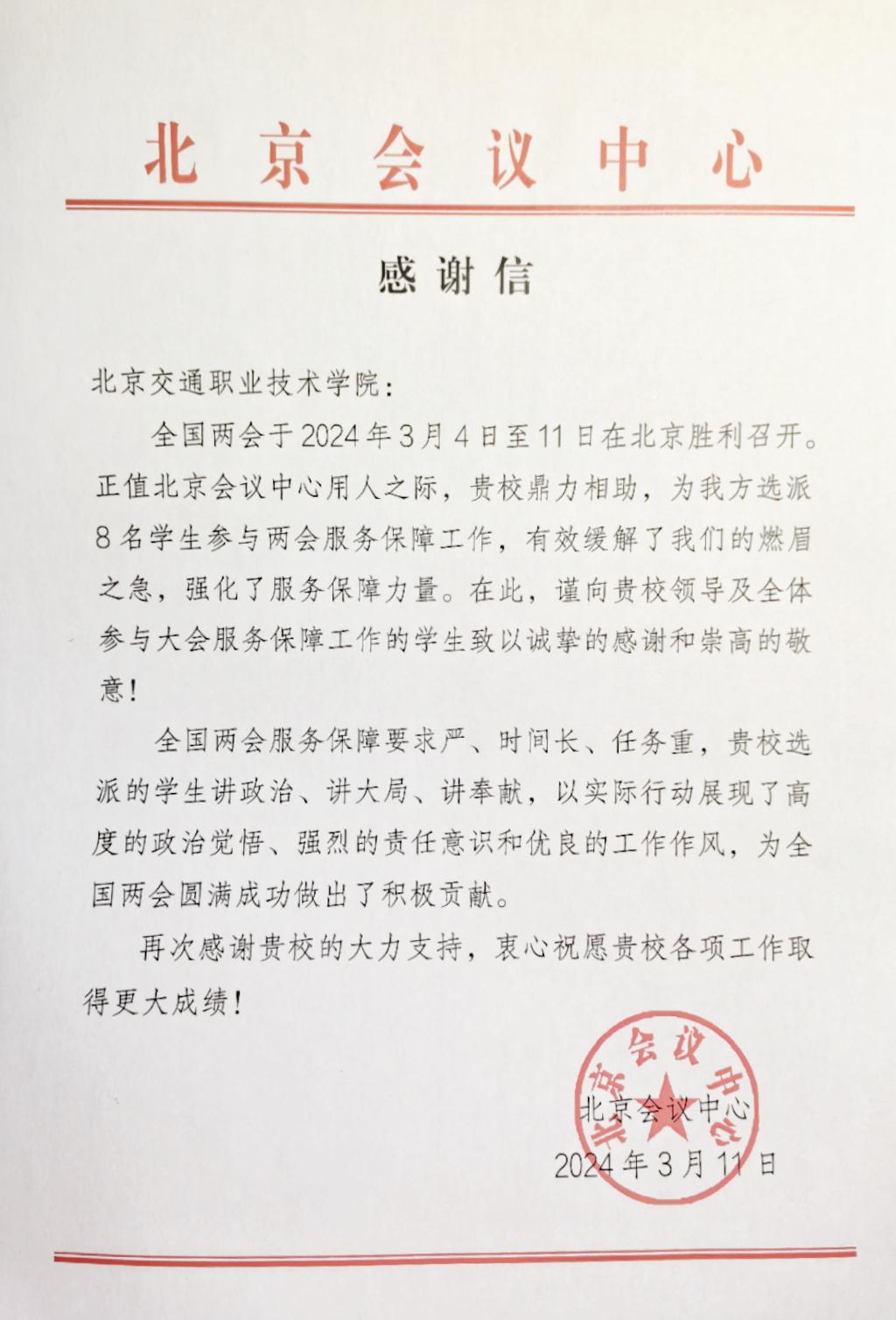北京会议中心对学院参与两会服务保障工作的8名学生致信感谢并颁发荣誉证书。参与志愿服务的同学表示,作为新时代的大学生,他们非常荣幸有机会能参与到国家级会议服务保障工作中。服务两会,不仅提升了他们的综合素质和应变能力,更近距离地感受到祖国的日益强大,青年一代的责任重大。他们将总结好、运用好服务两会的经验,不断在实践中提升自己的业务能力。