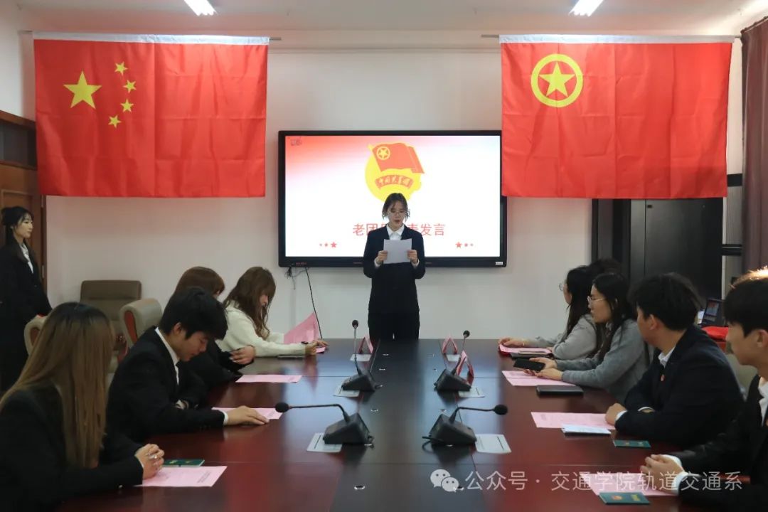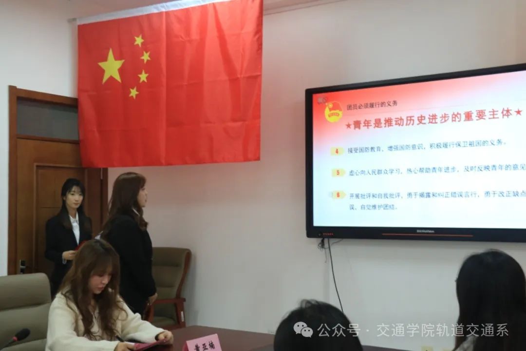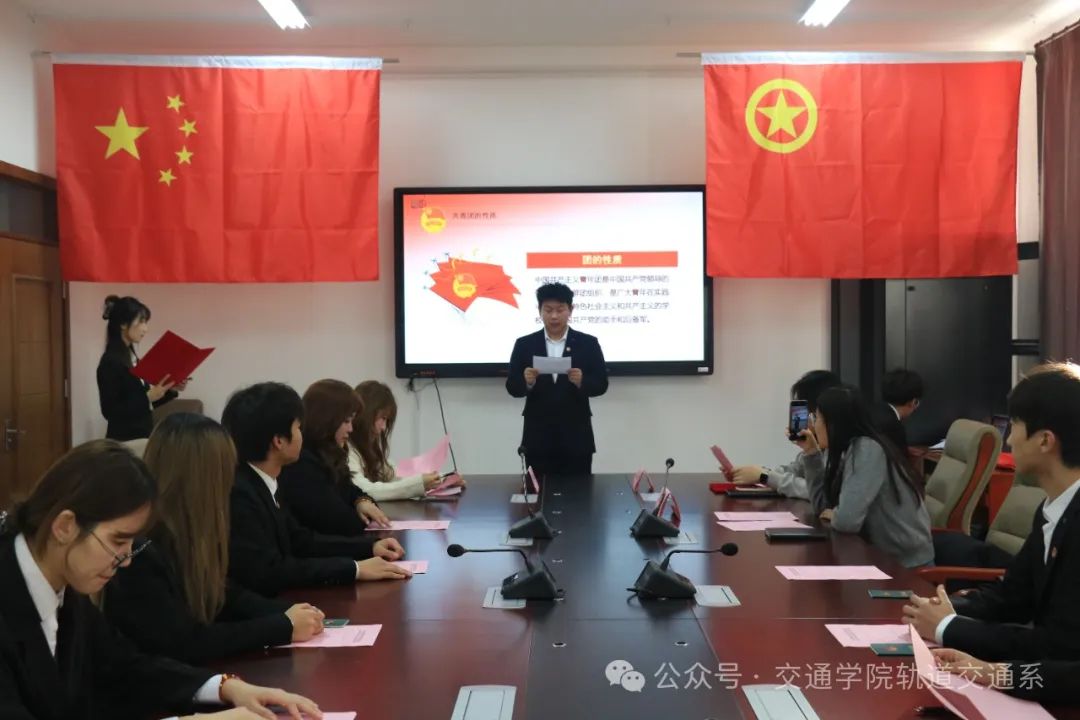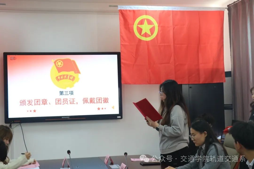 由王圣洁老师宣读新团员名单,本次新入团成员有四名:23车辆郭梓豪、23车辆刘梓桐、23信号孔聪旺、23运营吴欣阳。