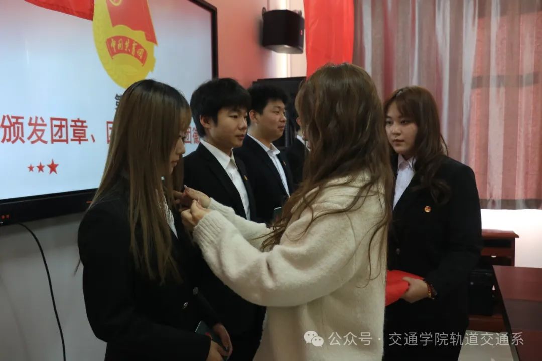 中国共青团团徽是每一位共青团员肩负重任的标志。在团旗的见证下,由黄亚楠老师为新团员们颁发团章、团员证并佩戴团徽。